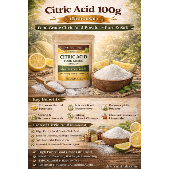 Citric acid naturally occurs in citrus fruits like lemons and oranges and is responsible for their sour taste. In powdered form, it is widely used as a natural souring agent, acidity regulator, and preservative. At Dry Fruit Hub, we provide citric acid that is 100% food safe, free from impurities, and suitable for daily culinary use.