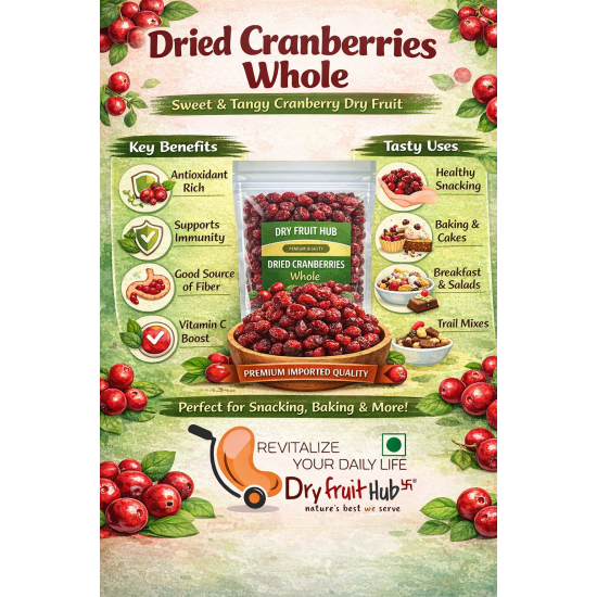 Experience the pure, unadulterated taste of the orchard with our Premium Whole Dried Cranberries. Unlike sliced varieties, these whole berries are carefully dried to lock in their natural moisture, resulting in a plump, juicy texture and a balanced tart-sweet profile. At Dry Fruit Hub, we source only the highest grade of berries to ensure that every handful you eat is bursting with flavor and vitality.
