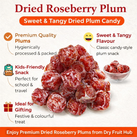 Dried roseberry plum is widely used as a ready-to-eat snack and is also popular in kids’ snack boxes, festive gifting, and party platters. It can be enjoyed on its own or paired with other dried fruits and candies for a colourful snack mix. Its attractive appearance and bold taste make it a favourite in Indian households.