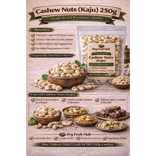 Enjoy the rich taste and creamy crunch of Dry Fruit Hub Cashew Nuts Kaju 250g Grade W320, carefully selected and hygienically packed to preserve freshness and quality. W320 cashews are among the most popular grades, known for their uniform size, premium appearance, and superior taste.