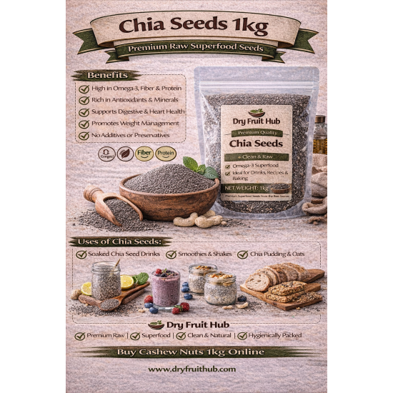 Dry Fruit Hub Chia Seeds 250g are premium-quality raw chia seeds, carefully cleaned and hygienically packed to retain freshness and natural quality. These tiny seeds are widely used in beverages, smoothies, baking, and everyday recipes due to their neutral taste and versatility.