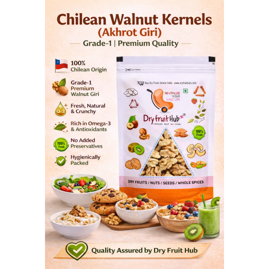 Choose Dry Fruit Hub’s Chilean Akrot Walnut Kernels for unmatched quality, purity, and taste—your trusted destination for premium dry fruits online.