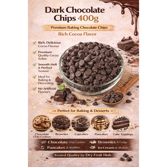 At Dry Fruit Hub, quality and freshness are our top priorities. These dark chocolate chips for baking are hygienically packed to maintain freshness, aroma, and taste for a longer shelf life. The convenient 400g pack size is ideal for regular home use, festive baking, and small commercial needs.