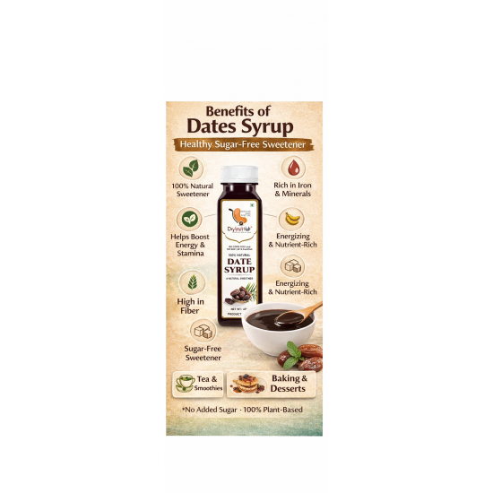 Dates Syrup 450g from Dry Fruit Hub is a pure and natural sweetener made from high-quality dates, offering rich taste, deep caramel flavor, and natural nutrition. This date syrup is prepared by gently extracting juice from premium dates without using refined sugar, artificial sweeteners, preservatives, or chemicals. If you are looking to buy dates syrup online, this is a healthy and delicious alternative to white sugar and honey.