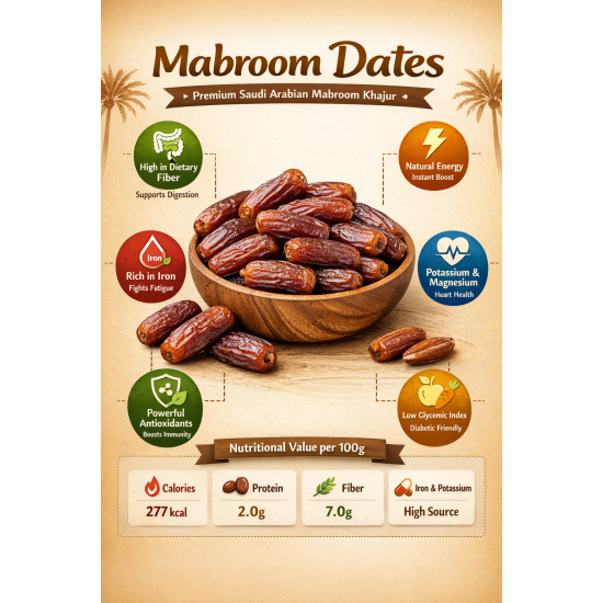 Mabroom Dates are packed with essential nutrients that support overall health and well-being:
