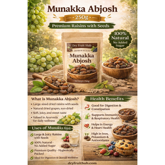 Munakka Abjosh, also known as large raisins with seeds, is a premium variety of dried grapes valued for its soft texture, natural sweetness, and high nutritional benefits. Our Munakka Abjosh 400g is carefully sourced, hygienically cleaned, and naturally sun-dried to preserve its authentic taste and health properties. These raisins are larger in size, juicy in bite, and contain natural seeds that enhance their traditional medicinal value.