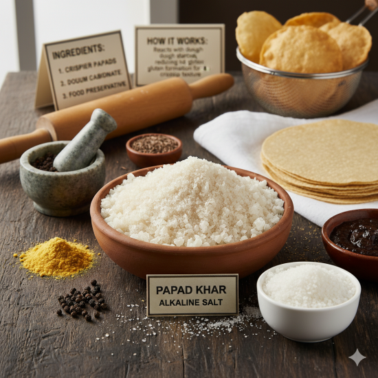 Sajji Khar is valued for its alkaline properties, which help improve texture, taste, and shelf life of certain foods. It plays a crucial role in papad making by enhancing crispiness, binding ingredients, and balancing acidity. This makes papad khar an essential ingredient for home-made papad, khichiya papad, fryums, and similar snacks.
