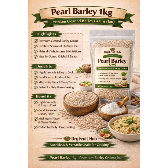 Dry Fruit Hub Pearl Barley 1kg is premium-quality cleaned barley grains (jau), carefully processed to ensure uniform size, purity, and freshness. Pearl barley is widely used in Indian and international cuisines for its mild taste and versatile cooking applications.